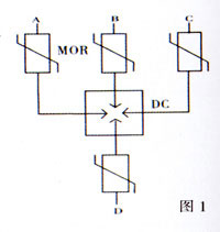 ZDB過壓保護(hù)器原理圖見圖1,圖中MOR為氧化鋅閥片,DC為單間隙體。由于本產(chǎn)品采用硅橡膠復(fù)合外套整體模壓一次成形,引出線采用硅橡膠高壓電纜,故安裝時(shí),無需考慮相間距離和對地距離,只需將標(biāo)有單元的電纜接地外,其余三個(gè)分別任意接A,B,C三相即可。
